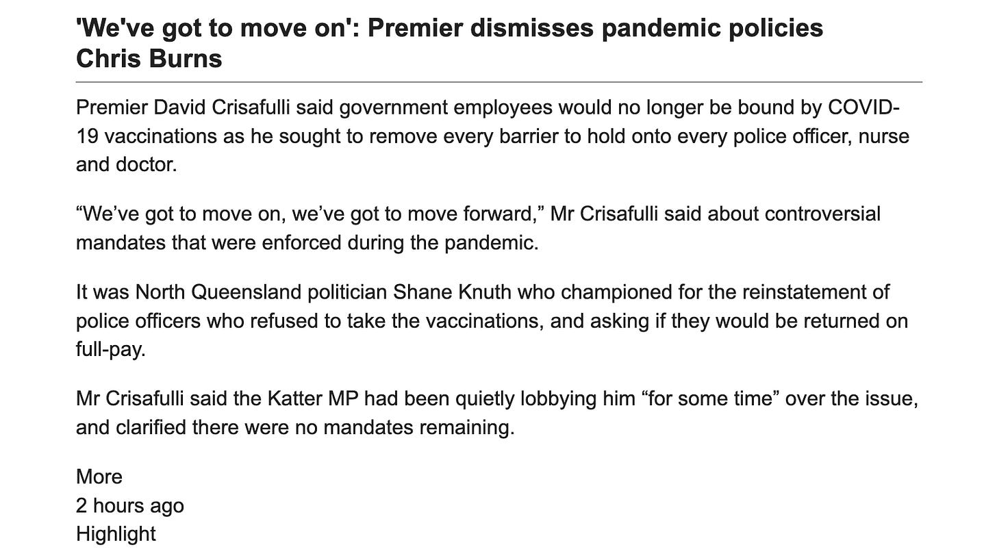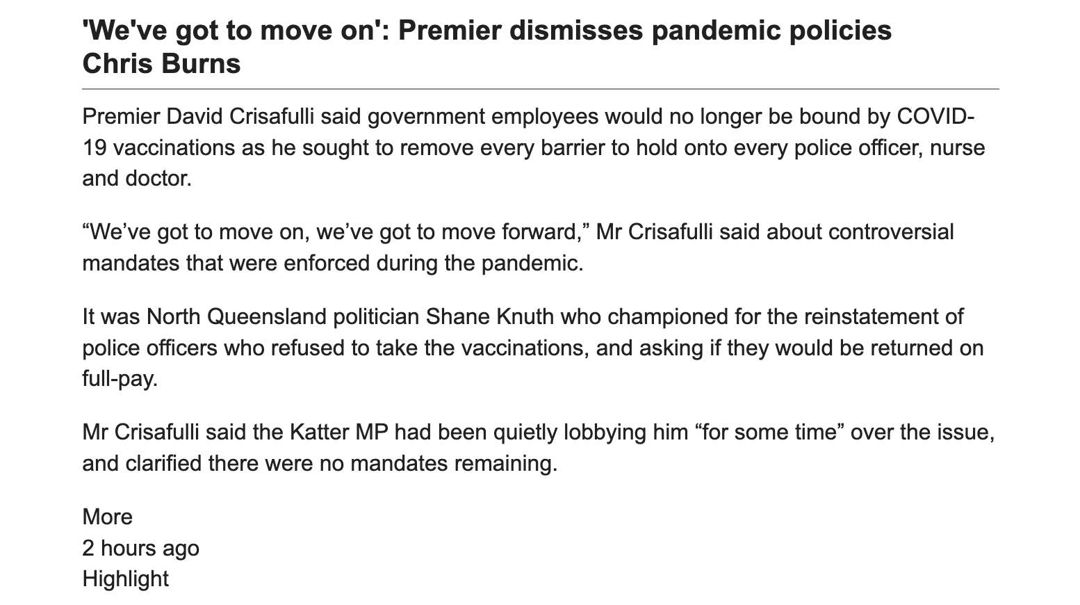 These words from Crisafulli's mouth sound good, but the reality is that these government workers have a lot more hoops to jump through to be able to do their jobs. For those in the medical field, AHPRA has requirements, too. Not seeing patients = a virtual death sentence for treating practitioners. How can you have 'Recency of Practice' if you've not been allowed to treat anyone?! For a few lucky ones, there will be ways around this, but for many, I don't think this 'decision' by Crusafulli is going to help them. He has no idea how these systems work!